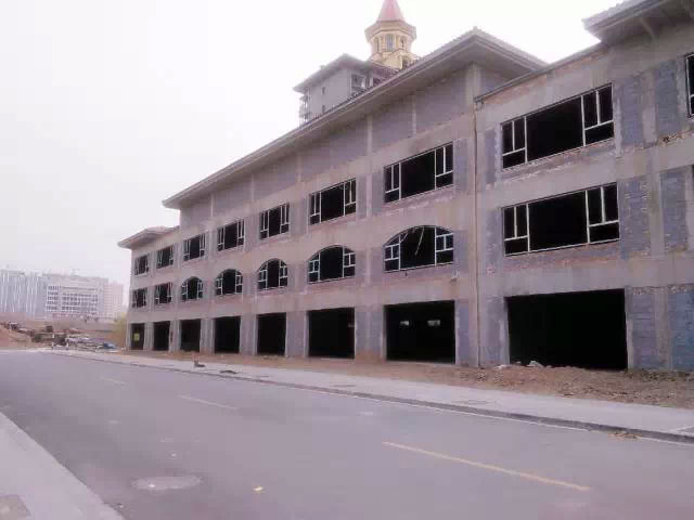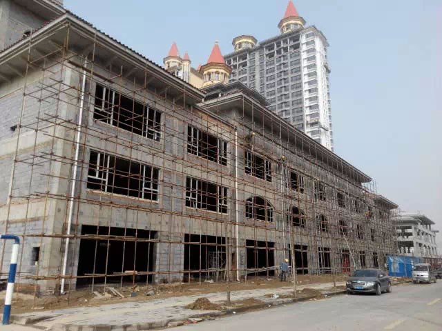 工人師傅正在緊鑼密鼓的進行外墻石材干掛,2015年6月底全面交工